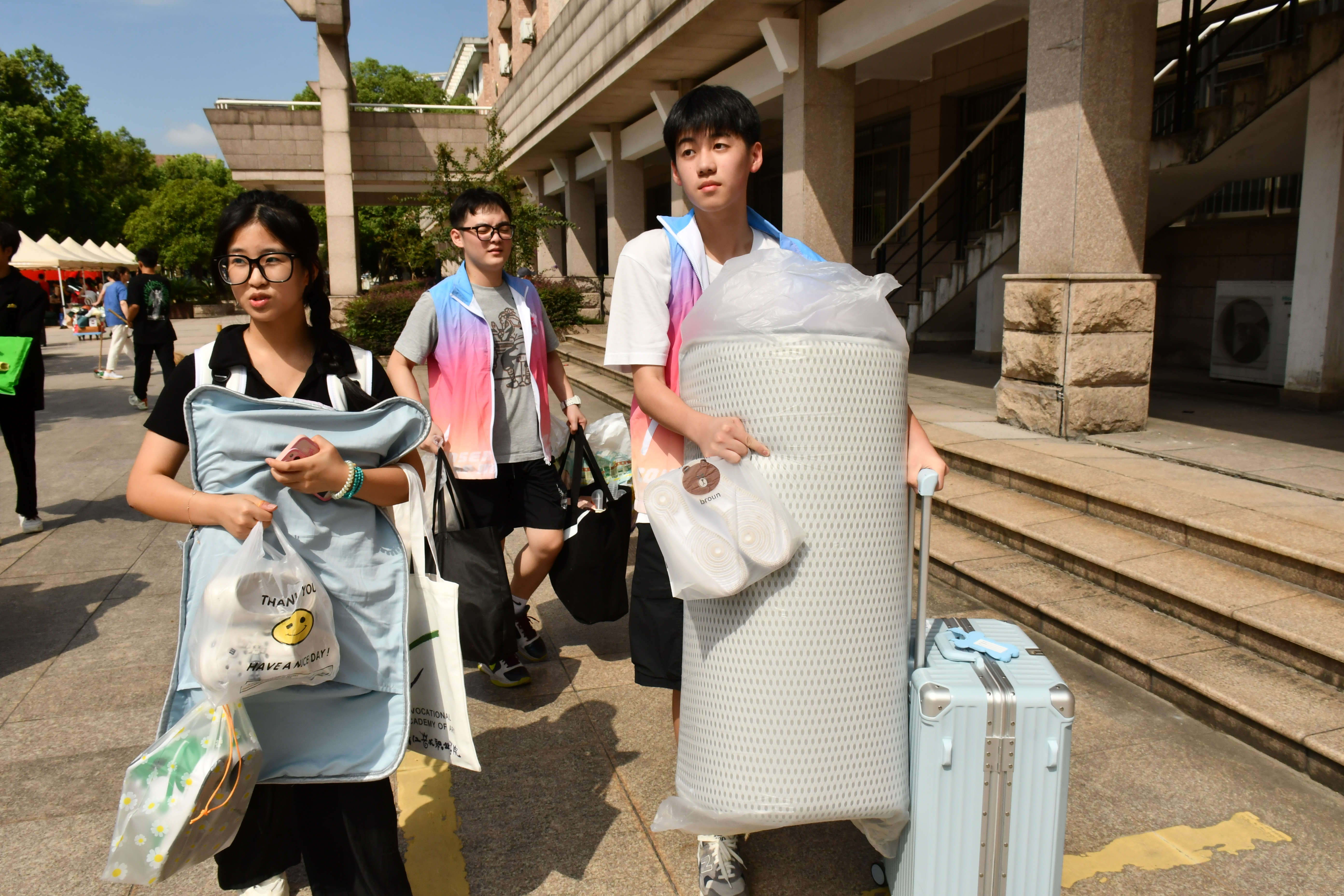 身穿红马甲的志愿者们精神饱满,在校园内引导车辆、看管和搬运行李等,为新生报到提供便利。他们来来往往的身影成为了报到现场一道靓丽的风景线。