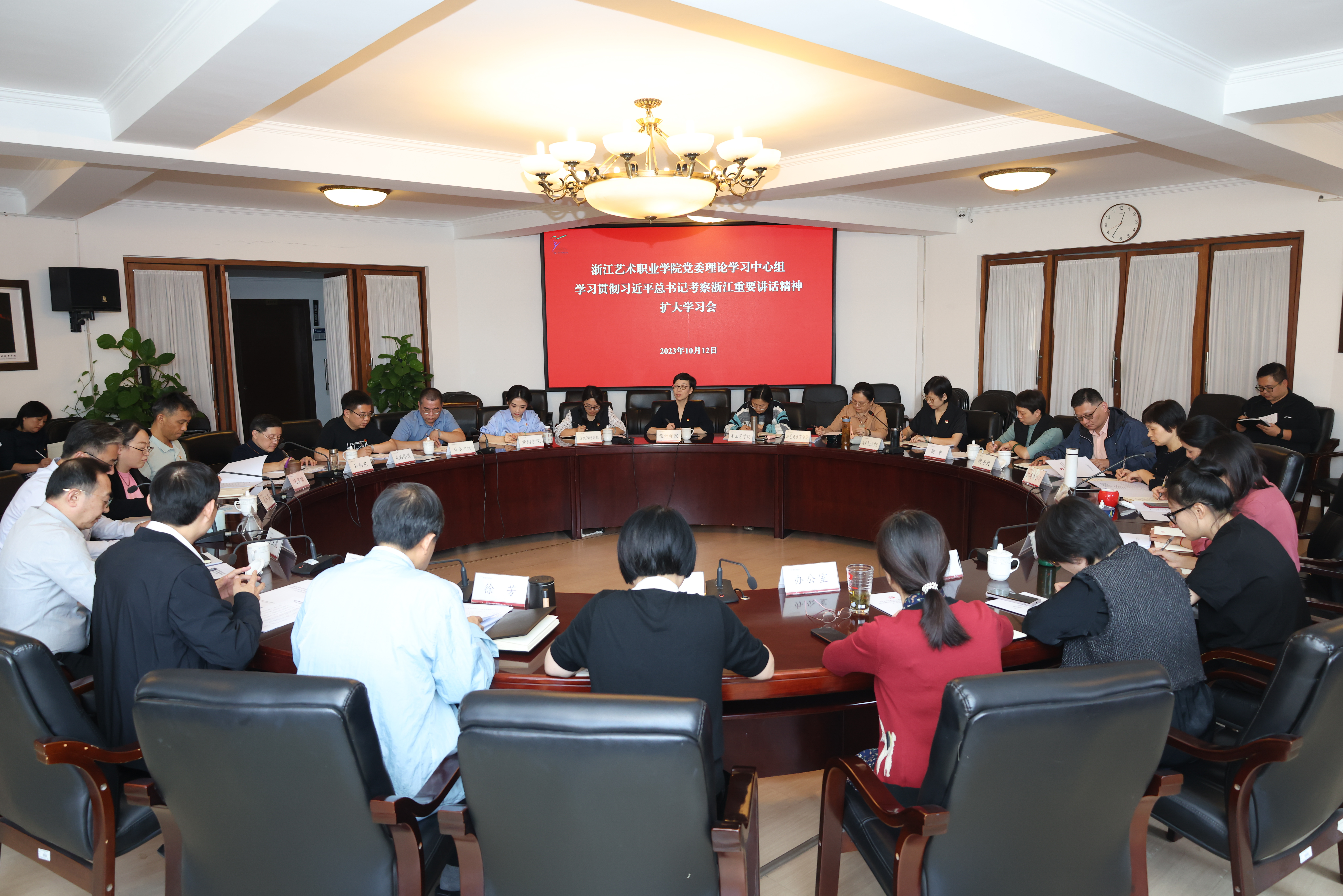 10月12日下午,浙江艺术职业学院召开党委理论学习中心组扩大学习会,传达学习贯彻习近平总书记考察浙江重要讲话精神。省文化和旅游厅党组成员、副厅长、第一巡察组组长刁玉泉到会指导,校党委书记薛亮主持学习会。校党委班子成员,职能教辅部门负责人、各二级学院党政负责人参加学习并作交流发言。