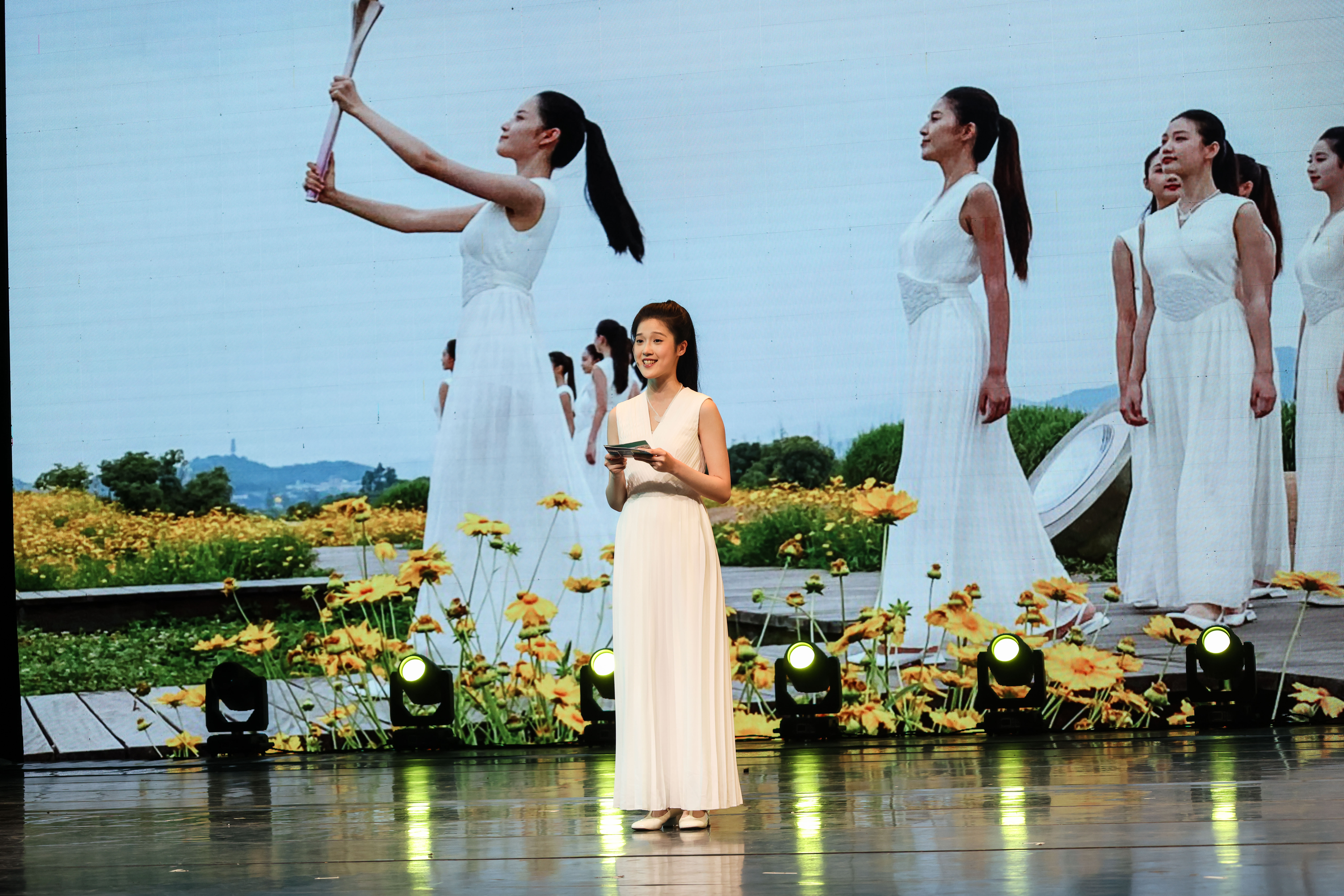在亚残运会开幕式上,我们身着金桂少女的华服,手持金色花环,饱含深情地和包含视障歌手在内的全场表演者共同演绎恢弘大气、旋律激昂、振奋人心的亚残运会主题曲《我的深情为你守候》。我还有幸担任了车长一职,在“大莲花”的日子里,每天负责清点人数、道具、餐盒、服装等。在这个与众不同的暑假,我收获了一生难忘的宝贵经历。我们将脚印深深刻画在时代的浪潮中,用心锤炼技艺,以青春的力量在国际舞台上大放异彩。让我们传承亚运荣光,续写人生华章。