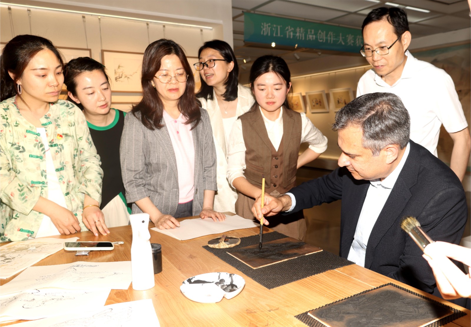 施睿耀一行还参观了设计学院、手工艺学院的教学场地和实训场所,观看了由浙江非遗传习院和手工艺学院共同举办的“匠心守艺”非遗创意作品展,亲自体验了水印木刻,对我校深厚的办学底蕴与近年高速发展有了更直观的了解,为双方进一步合作奠定了基础。