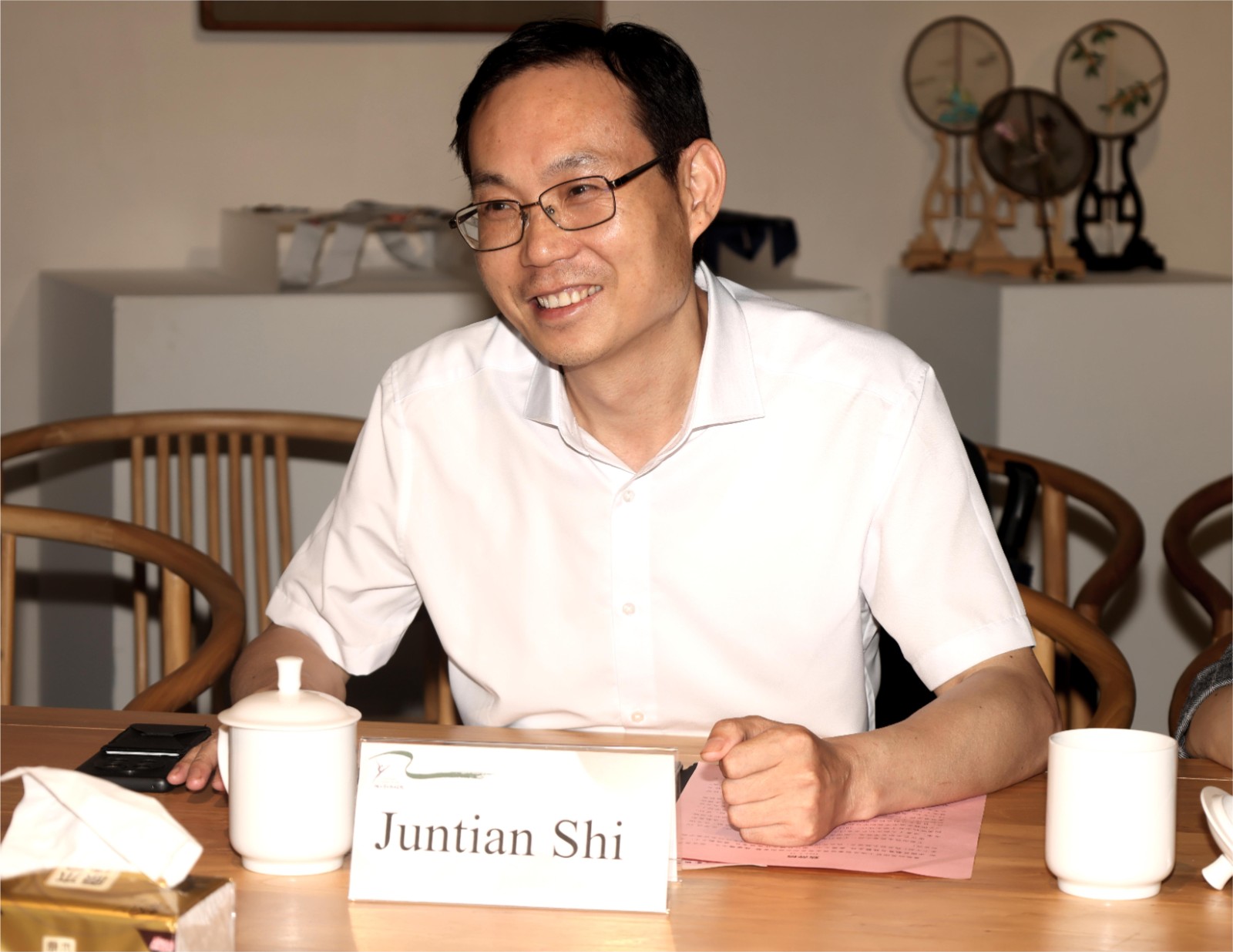 座谈会上,施俊天代表学校对施睿耀一行致以热烈欢迎,并介绍了学校办学历史、专业设置、办学特色。施俊天表示,英国职业教育最大的特色就是产教融合,通过“学徒制”来体现,而我校的民族传统技艺专业是教育部第三批现代学徒制试点专业,希望通过此次交流,能够进一步拓展与英国职业教育的合作,提高我校专业建设的水平和人才培养的国际视野。