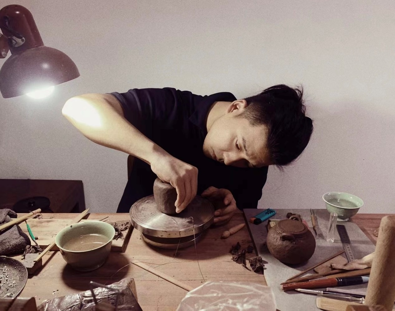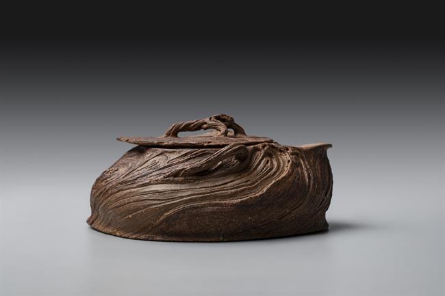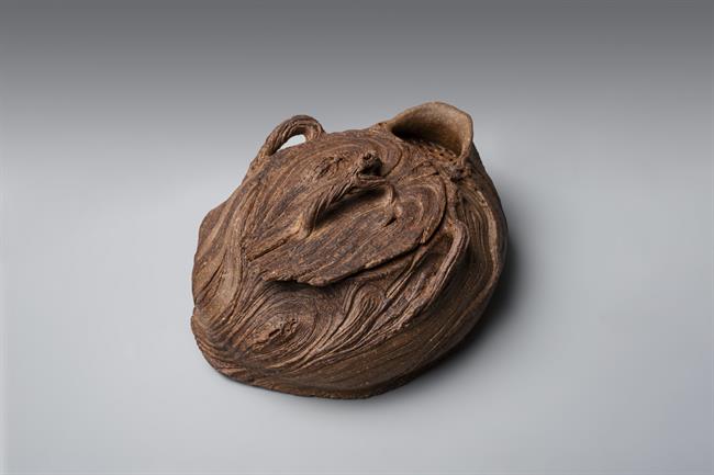 创作理念:黏土真的很神奇,因有水的加持,柔软似丝绸划过指尖,因有火的加持,又回归岩石般质地。创作者只有谦卑地顺应泥性,才能通过土的语言来表达。本次宝瓶的创作手法纯粹,只拉坯不修坯,尽可能保留创作痕迹而一气呵成。捉手是拉坯过程中的边角料率意堆砌,瓶身椭圆壶口向内边稍倾,看似随意的手法又尽量满足实用需求,盈盈一握,出汤利索,烤银后的金属质感又增添了一份现代气息,与写意的创作手法相得益彰,是创作者内心的一次浪漫之旅。