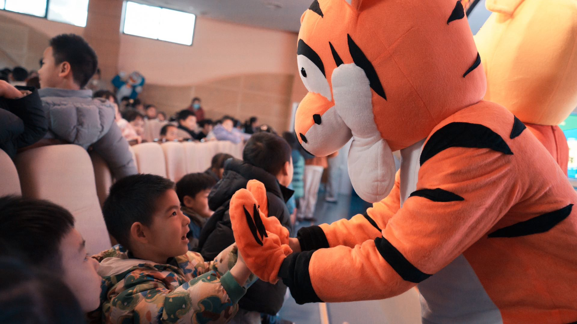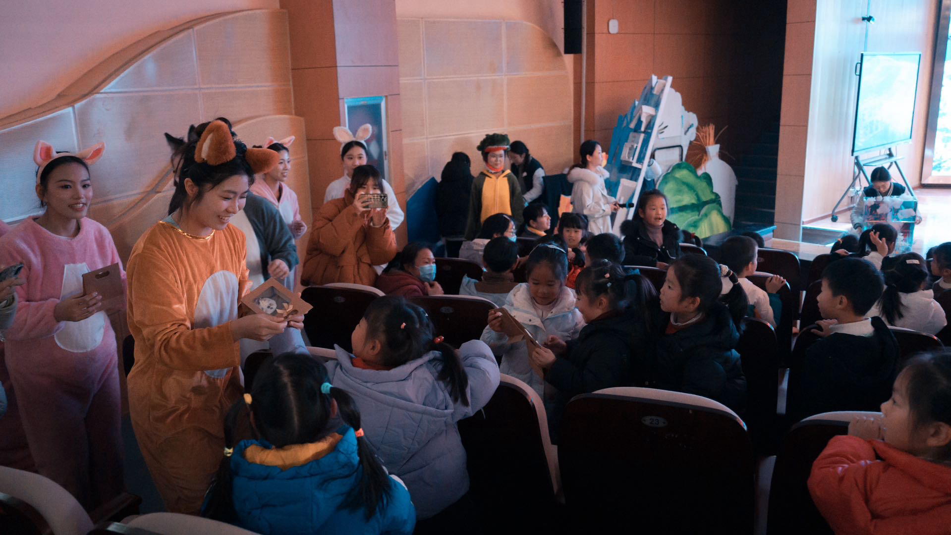 为了让小朋友们能够沉浸其中,享受每一刻的欢乐,演出全程都主打“沉浸式”。演出前,由学生装扮的老虎、兔子等可爱人偶在入口处欢迎,在观众席互动,憨态可掬的形象和可爱有趣的动作吸引小朋友们走上前去,营造“沉浸式入场”;演出中,紧贴剧情的道具造型有趣逼真,开放式问题、魔法动作等的设计,使得小朋友们与演员们的互动更加自然和投入,打造“沉浸式观演”;谢幕时,演员们来到小朋友们中间打破舞台界限零距交流,小朋友们欣喜不已、久久不愿散场,创造“沉浸式回味”。