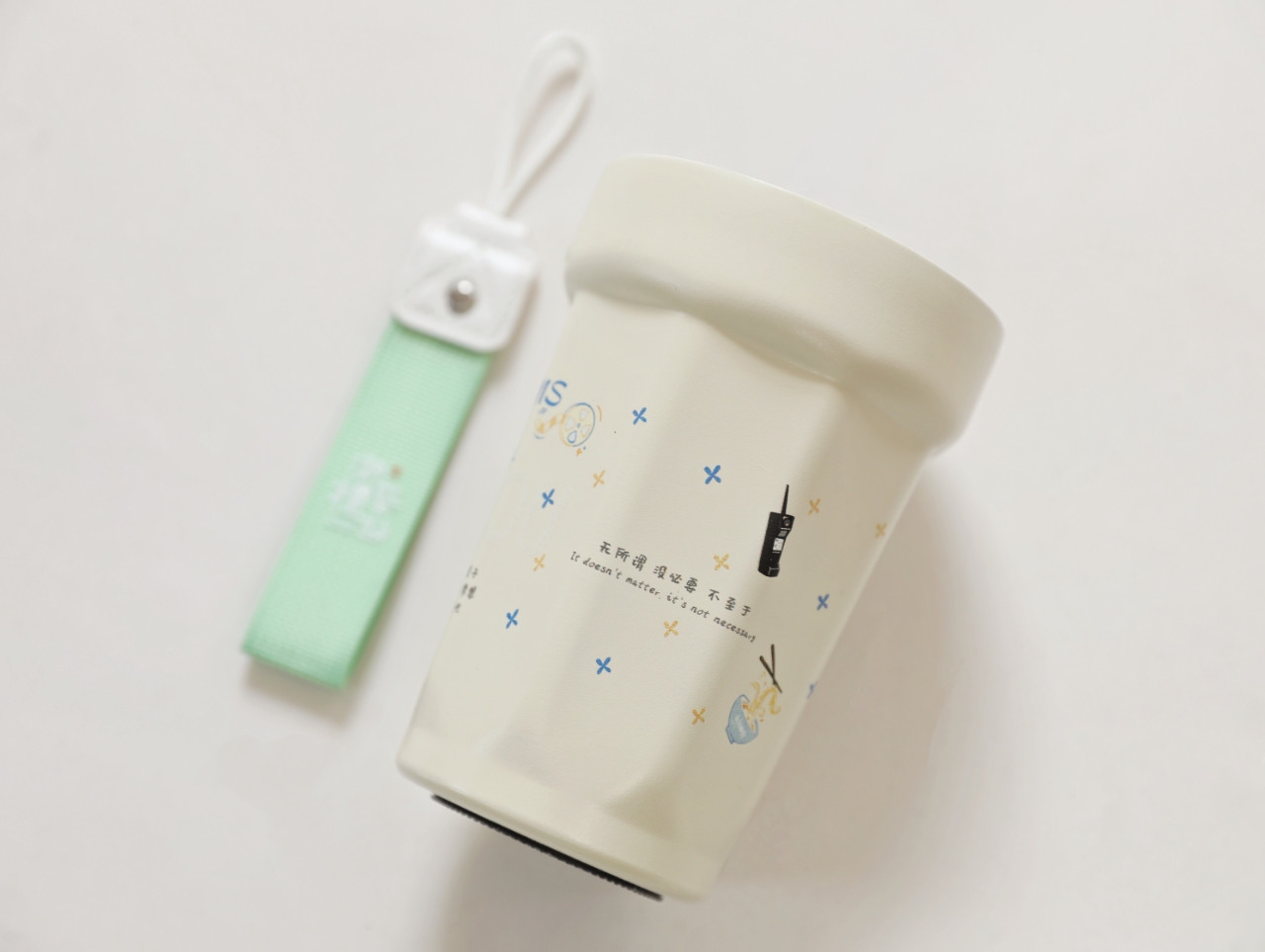 杯身以代表“天堂”的主题色蓝白色为主色调,浮现出“HANG ZHOU”字样,四面用具有年代感和象征性的物品点缀。桂花雨散落在错落的经典台词中,既是话剧中结局的复现也是杭州精神的象征。杯子将杭州的城市记忆与话剧精神凝结为可触碰的温度容器,通过饮水的日常仪式,让怀旧符号、奋斗与梦想在热气蒸腾间交织重生。