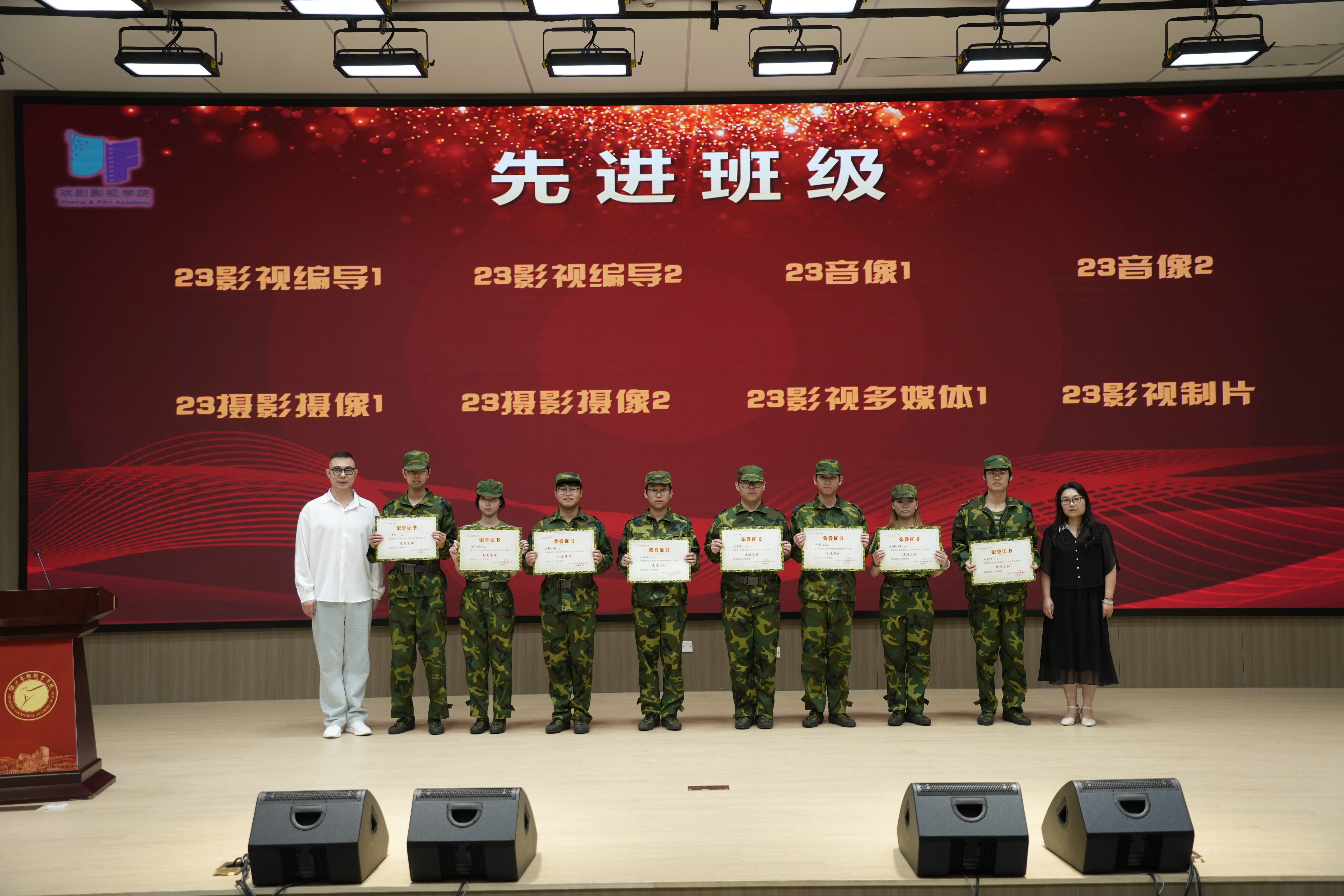 经过严格考核和综合评定,音乐学院23民乐班、23键盘班;舞蹈学院23舞蹈编导班、23少儿编导班;戏剧影视学院23影视编导1班、23影视编导2班、23音像1班、23音像2班、23摄影摄像1班、23摄影摄像2班、23影视多媒体1班、23影视制片班;设计学院23服装2班、23广告1班、23动漫1班、23动漫2班、23环艺1班;手工艺学院23民传班、23文创班;演艺与教育教学院23定向班、23学前1班、23学前3班凭借在军训期间展现出的顽强拼搏精神、严明的组织纪律性和突出的团队协作能力,荣获“军训先进班级”荣誉称号。