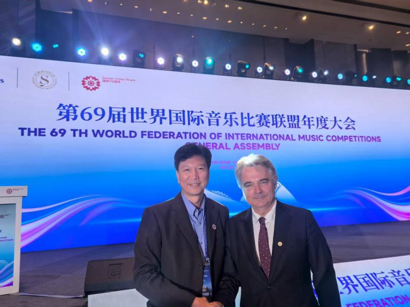 杨茹文与国际音乐比赛联盟主席在会议上的合影