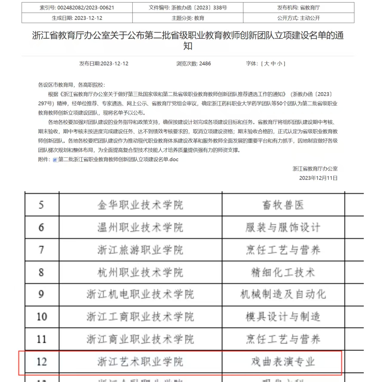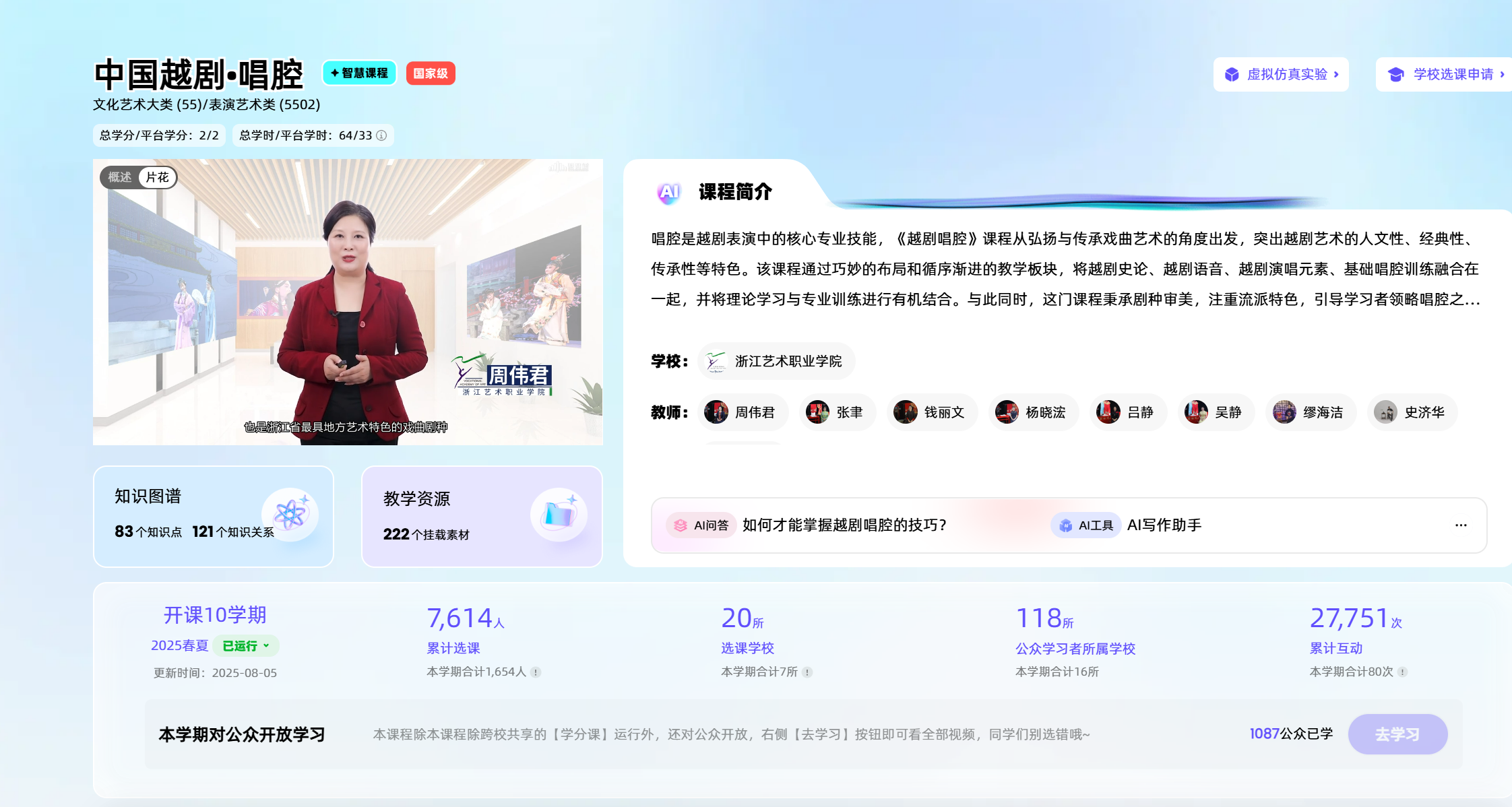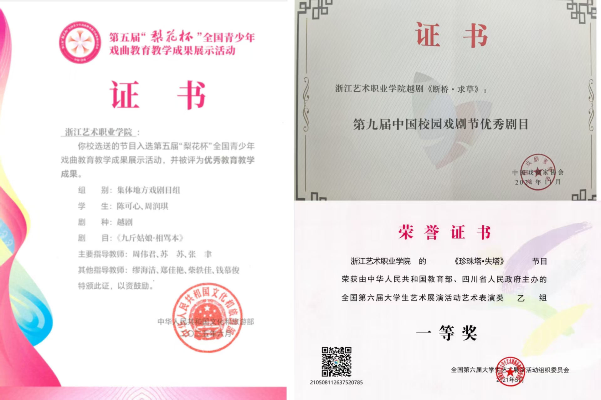 坚持教科研创并重发展、协同推进,获国家级教学成果二等奖3项,省级教学成果特等奖、一等奖5项。戏曲表演专业获评全国首批民族文化传承与创新示范专业点,教育部第三批现代学徒制试点,国家级骨干专业和省级优势专业,2019年戏曲表演专业群入选“中国特色高水平高职学校和专业建设”计划单位。教学团队建设有《中国越剧·唱腔》国家级在线精品课程、“戏曲表演专业教学资源库”“越剧唱腔教学资源共享共建平台”,首创“越音易通”越剧语音电子字典APP填补了越剧音韵理论与新媒体技术融合的空白。建设省级以上教材3本、新形态教材2本,20余个教科研项目获省部级以上立项。获批国家艺术基金项目4项,浙江文化艺术发展基金资助项目3项,量身打造梦幻版《牡丹亭》《红楼人物秀》《步步惊心》、青春越剧《五女拜寿》《断桥》、原创越剧《幽兰逢春》等优秀舞台作品20余部,创排小剧场越剧《颜氏》,开启校本特色“演艺新空间”新探索。