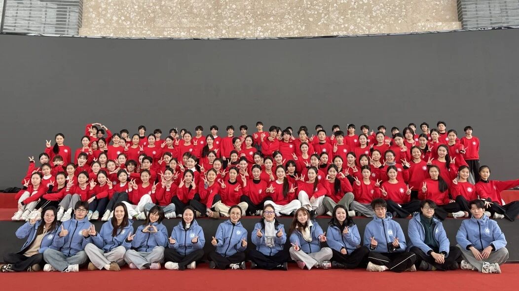 群舞的魅力,在于“千人如一”的默契,更在于“舍小我成大我”的格局。没有个人特写的光环,只有集体画面的和谐;没有单独的高光时刻,只有舞者们动作同步的震撼。为了让队形变换如行云流水,学子们对着标记点反复走位,汗水浸透练功服,膝盖磨出瘀青,冒雨坚持排练,却从未有人喊停。有同学带着腰伤坚持排练,说的是“不想拖团队的后腿”;有同学放弃与家人团聚的时光,笑着说:“能和大家一起完成这场演出,就是最好的新年礼物。”这份坚守,正是浙艺现代“舞者精神”的最好体现。