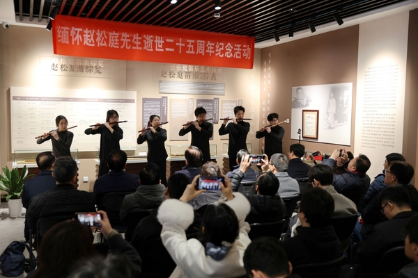 笛音寄深情,经典永流传。我校竹笛专业教师常轶伟带领学生演奏了赵松庭先生的经典作品《早晨》,悠扬婉转的笛声回荡在纪赵松庭念馆中,既寄托了对先生的深切缅怀,更展现了赵派笛乐艺术的独特魅力。