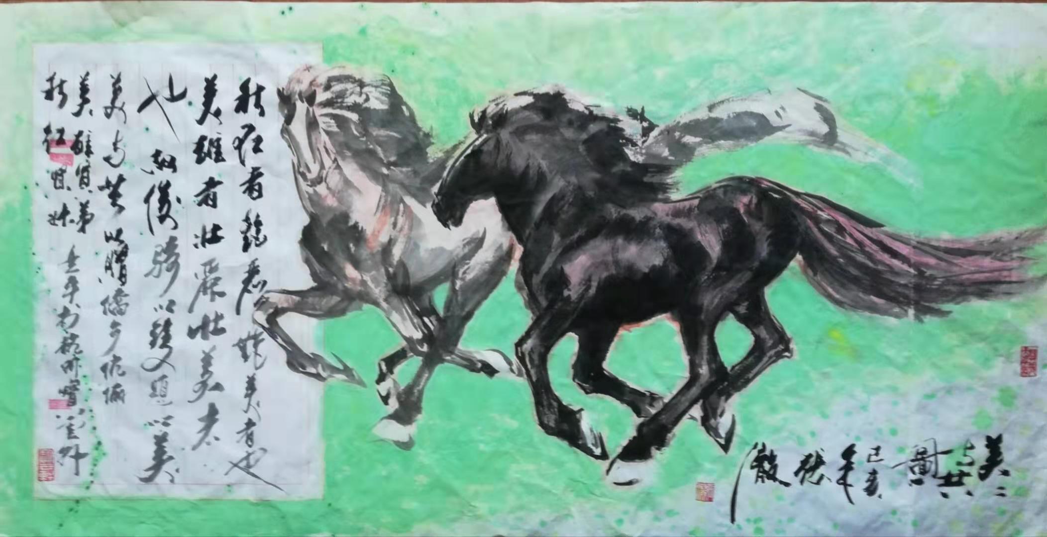 有青田侨乡学子张秋红、季美雄伉俪自巴塞罗那来访,亦“有朋自远方来”矣!秋红者,艳美也:美雄者,壮美也。于是骏马以双,题以“美美与共”赠之。