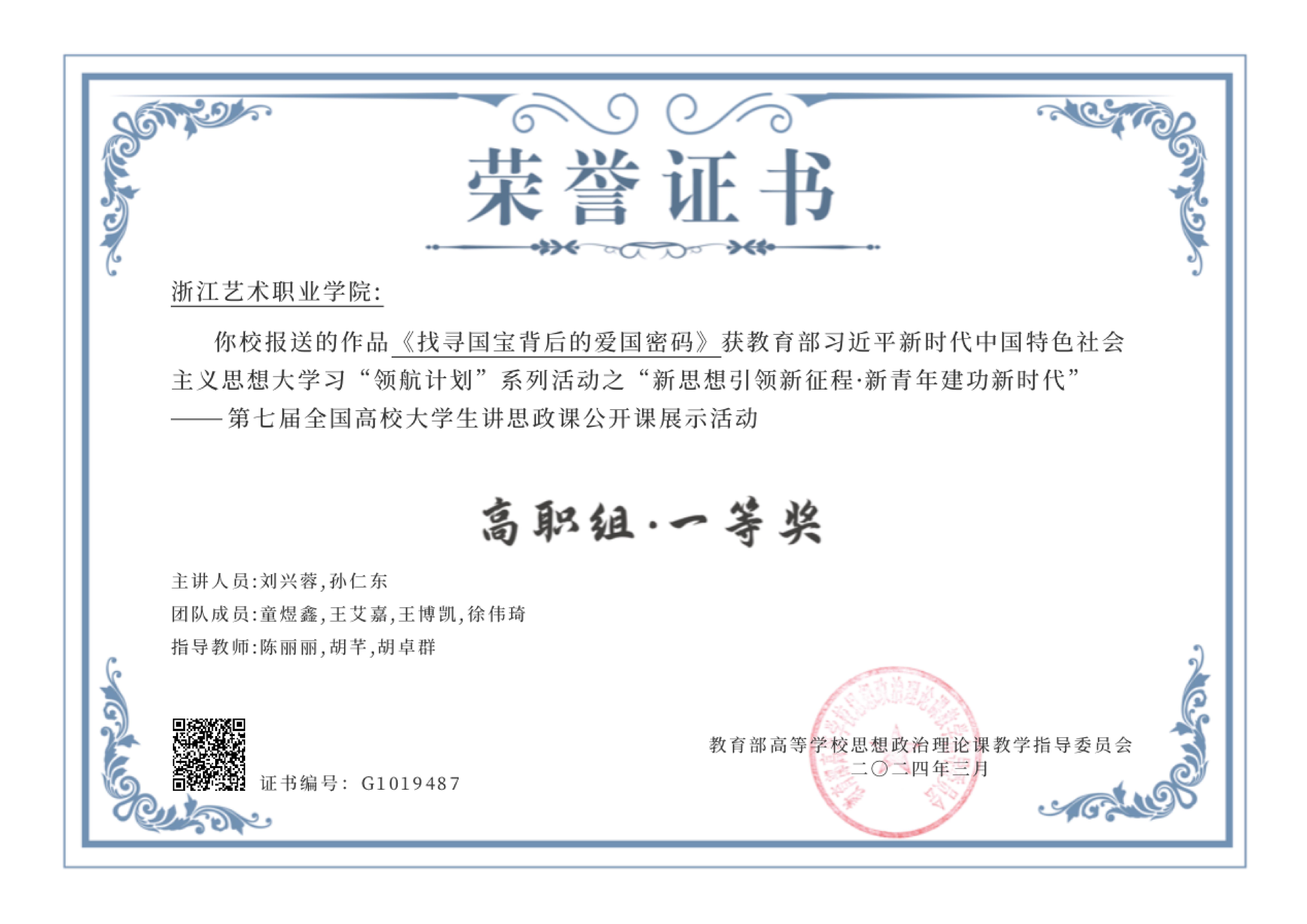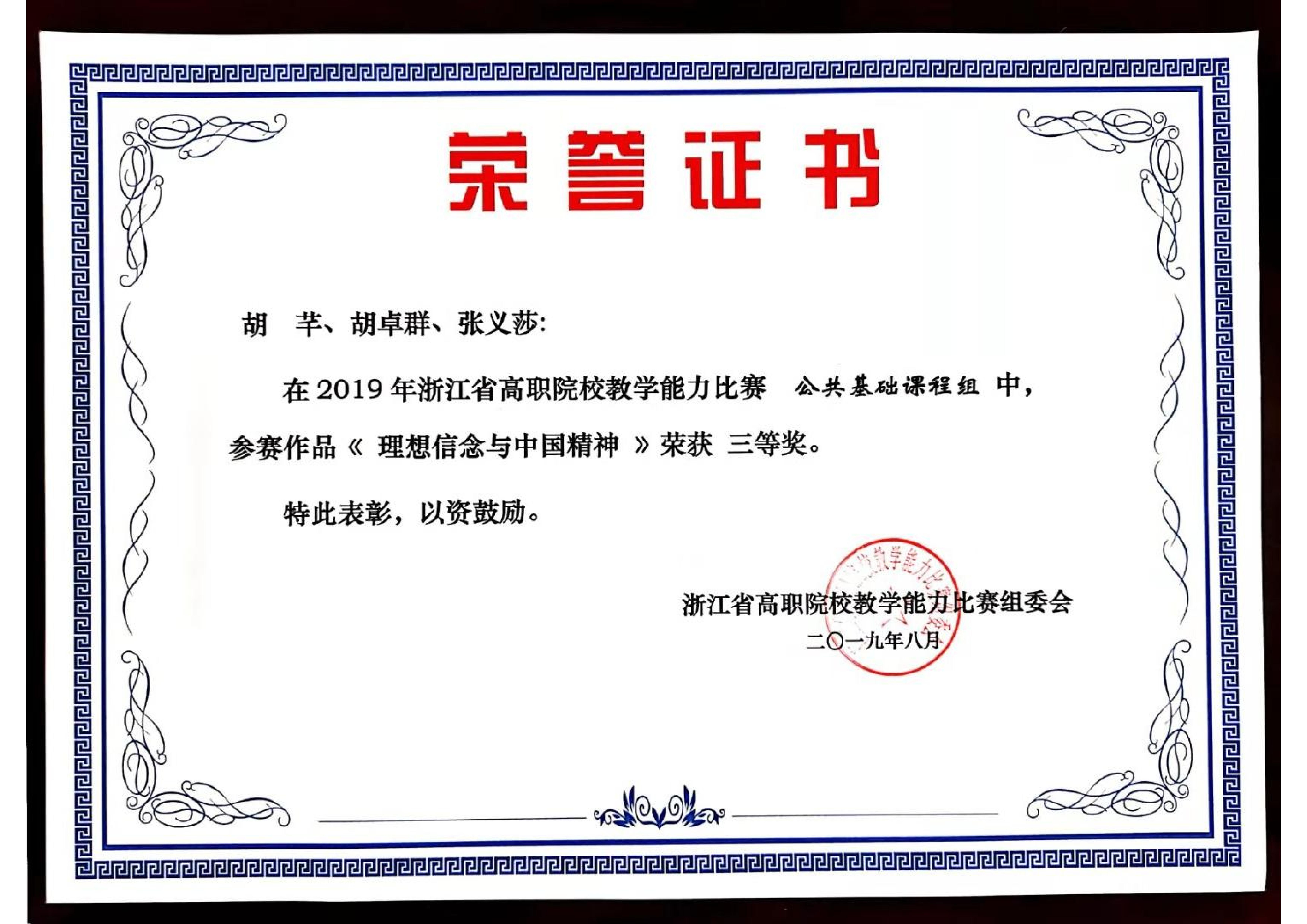 ▲《理想信念与中国精神》荣获2019年浙江省高职院校教学能力大赛三等奖